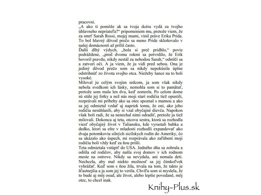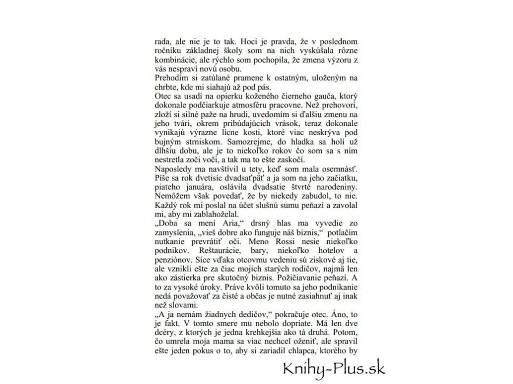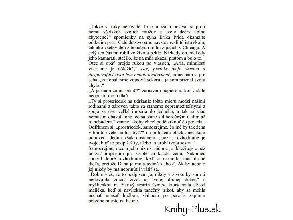 Dohodnuté manželstvo ich má spojiť. Minulosť rozdeliť. Aria Rossi sa po rokoch vracia domov, aby splnila vôľu svojho otca - vydať sa za Kiana Prida, muža, ktorý jej kedysi ublížil. On už však dávno nie je tým istým chlapcom zo školy. Je úspešný a nebezpečný... a nikdy na ňu nedokázal zabudnúť. Medzi povinnosťou a túžbou sa rodí niečo skutočné. Ale bude to stačiť? Dokáže Aria odpustiť a dať šancu láske?. celý príbeh je o tom že by si bojoval o lásku,je to veľmi zaujímavý pribeh ,ktory každy by mal prečitať.